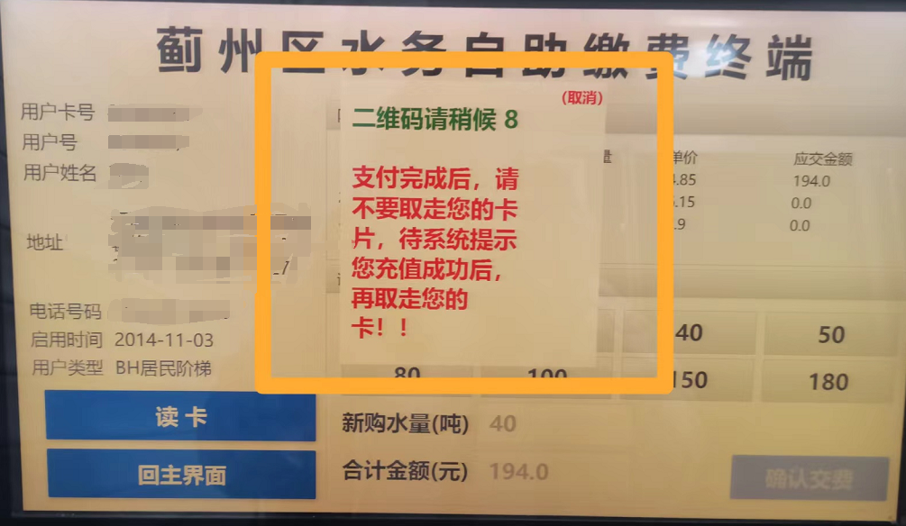 手機(jī)繳費(fèi)完成后不要取卡,待系統(tǒng)提示成功后再取卡,如圖