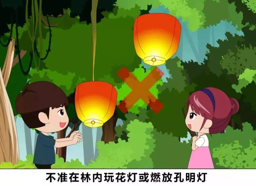 不準(zhǔn)在林區(qū)里玩花燈或者燃放孔明燈,孔明燈雖然可以飛得很高很高,但是也很容易被林內(nèi)的樹枝攔下,從而引發(fā)可怕的森林大火!